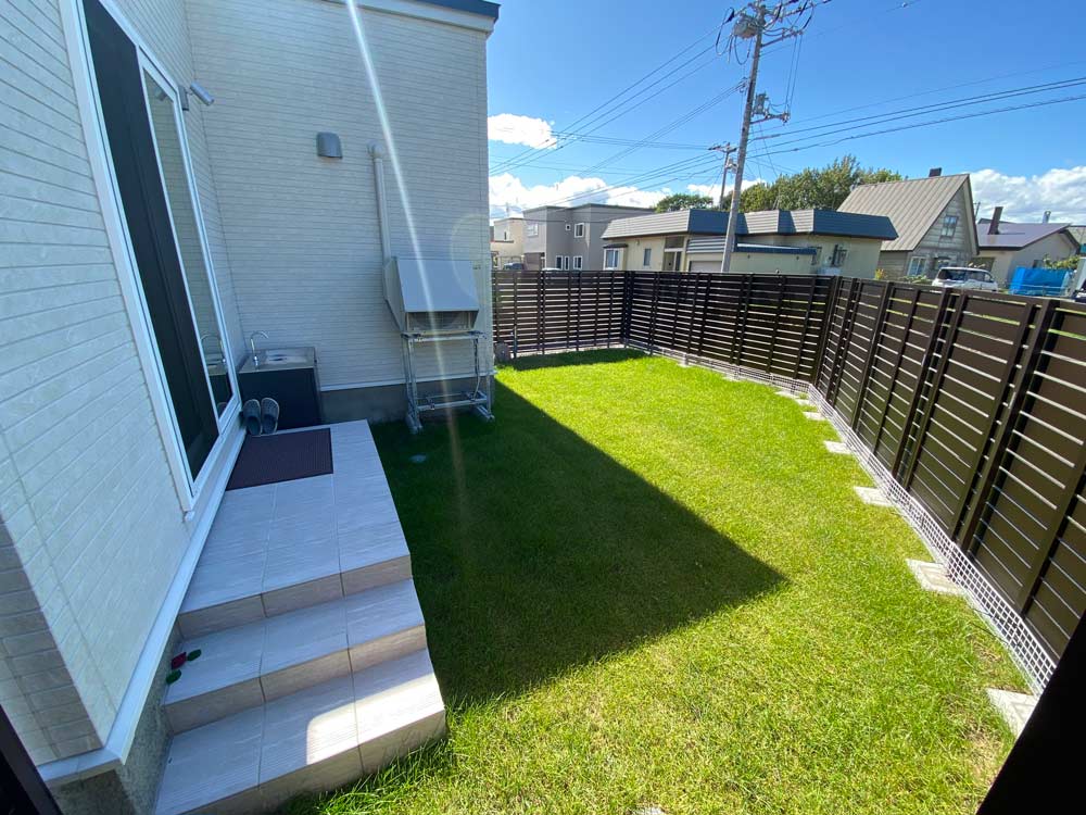 手間がかかるのは承知の上で地面には‘天然芝’を敷きました。